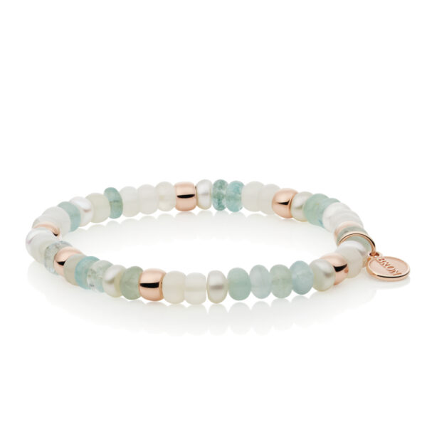Edelsteen: aquamarijn, witte maansteen, zoetwater parel.