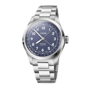 Een Oris Big Crown Pointer date horloge met een stalen kast en stalen band.